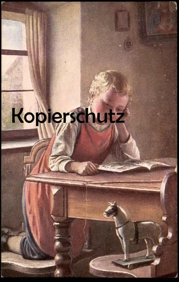 ALTE KÜNSTLER POSTKARTE MÄDCHEN MIT SPIELZEUG BUCH SCHAUKELPFERD Kind child girl enfant photo postcard cpa AK