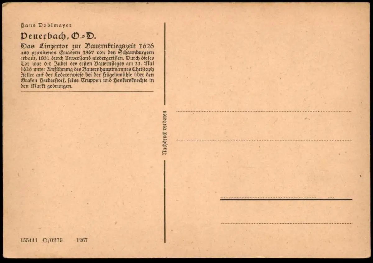 ALTE KÜNSTLER POSTKARTE PEUERBACH DAS LINZERTOR ZUR BAUERNKRIEGSZEIT 1626 AUS GRANITENEN QUADERN 1367 VON DEN SCHAUMBUGERN ERBAUT, 1831 DURCH UNVERSTAND NIEDERGERISSEN. DURCH DIESES TOR WAR DER JUBEL DES ERSTEN BAUERNSIEGES AM 21. MAI 1626 UNTER ANFÜHRUNG DES BAUERNHAUPTMANNES CHRISTOPH ZELLER AUF DER LEDERERWIESE BEI DER HÜGELSMÜHLE ÜBER DEN GRAFEN HERBERSTORF Herberstorff, SEINE TRUPPEN UND HENKERSKNECHTE IN DEN MARKT GEDRUNGEN. HANS DOBLMAYER