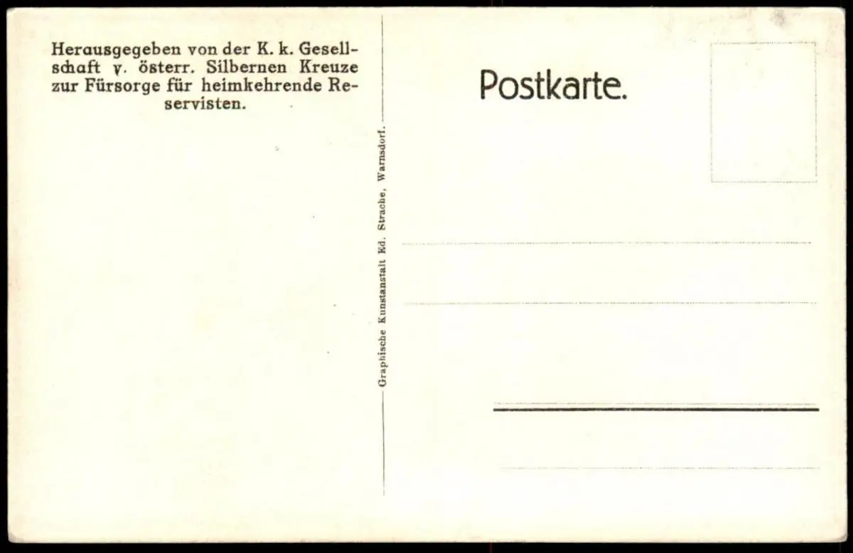 Verlag: Ed. Strache, Warnsdorf, herausgegeben von der K. k. Gesellschaft v. österreichischen Silbernen Kreuze zur Fürsorge für heimkehrende Reservisten
