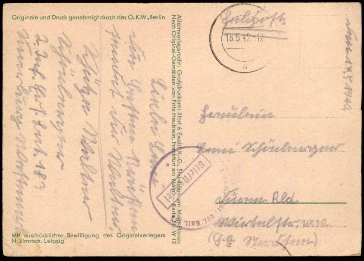 Gelaufen: 18.05.1942 mit Tarnstempel sowie Briefstempel nach Düren