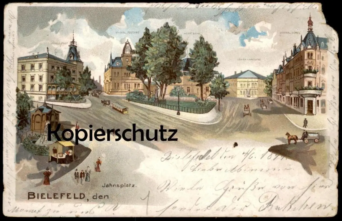 ALTE LITHO POSTKARTE BIELEFELD JAHNSPLATZ LÖWEN-APOTHEKE CENTRAL-HOTEL WESTF. BANK KAISERLICHES POSTAMT HOTEL POST 1899