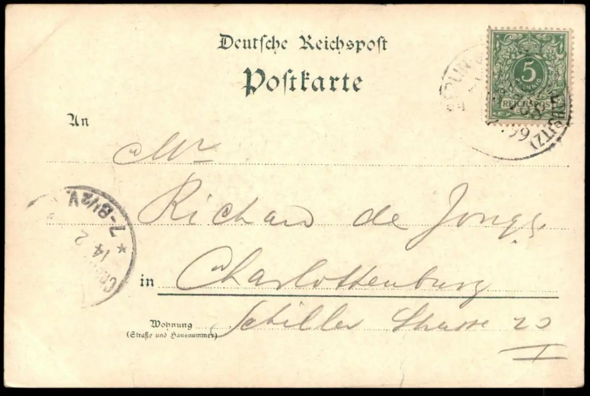 Gelaufen: 14.02.1899 mit Bahnpoststempel Zug 768 Berlin - Forst (Lausitz) nach Charlottenburg