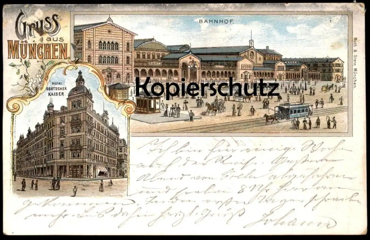 ALTE LITHO POSTKARTE GRUSS AUS MÜNCHEN HOTEL DEUTSCHER KAISER BAHNHOF PFERDEBAHN Verlag: Moch & Stern, München