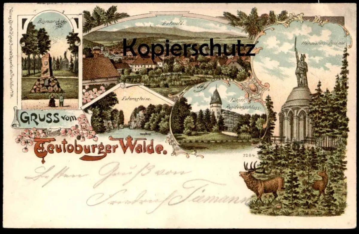 ALTE LITHO POSTKARTE GRUSS VOM TEUTOBURGER WALDE 1899 DETMOLD BISMARCKSTEIN HERMANNSDENKMAL RESIDENZSCHLOSS EXTERNSTEINE