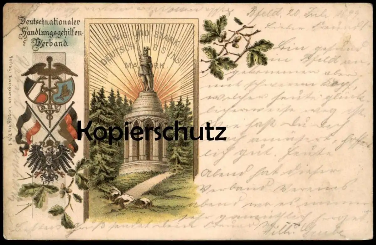 ALTE LITHO POSTKARTE HERMANNSDENKMAL DETMOLD DEUTSCHNATIONALER HANDLUNGSGEHILFENVERBAND - EWIG UND STARK DEUTSCH BIS INS MARKVerlag: Zweigverein Leipzig des D. H. V.
