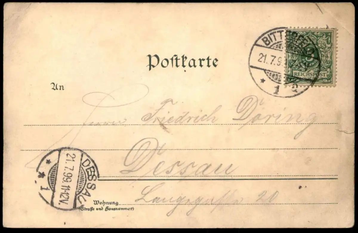 Gelaufen: 21.07.1899 mit Stempel Bitterfeld nach DessauErhaltung (s. Scan): mittel, Ecke oben links bestoßen, minimaler Einriss linksseitig / 918777