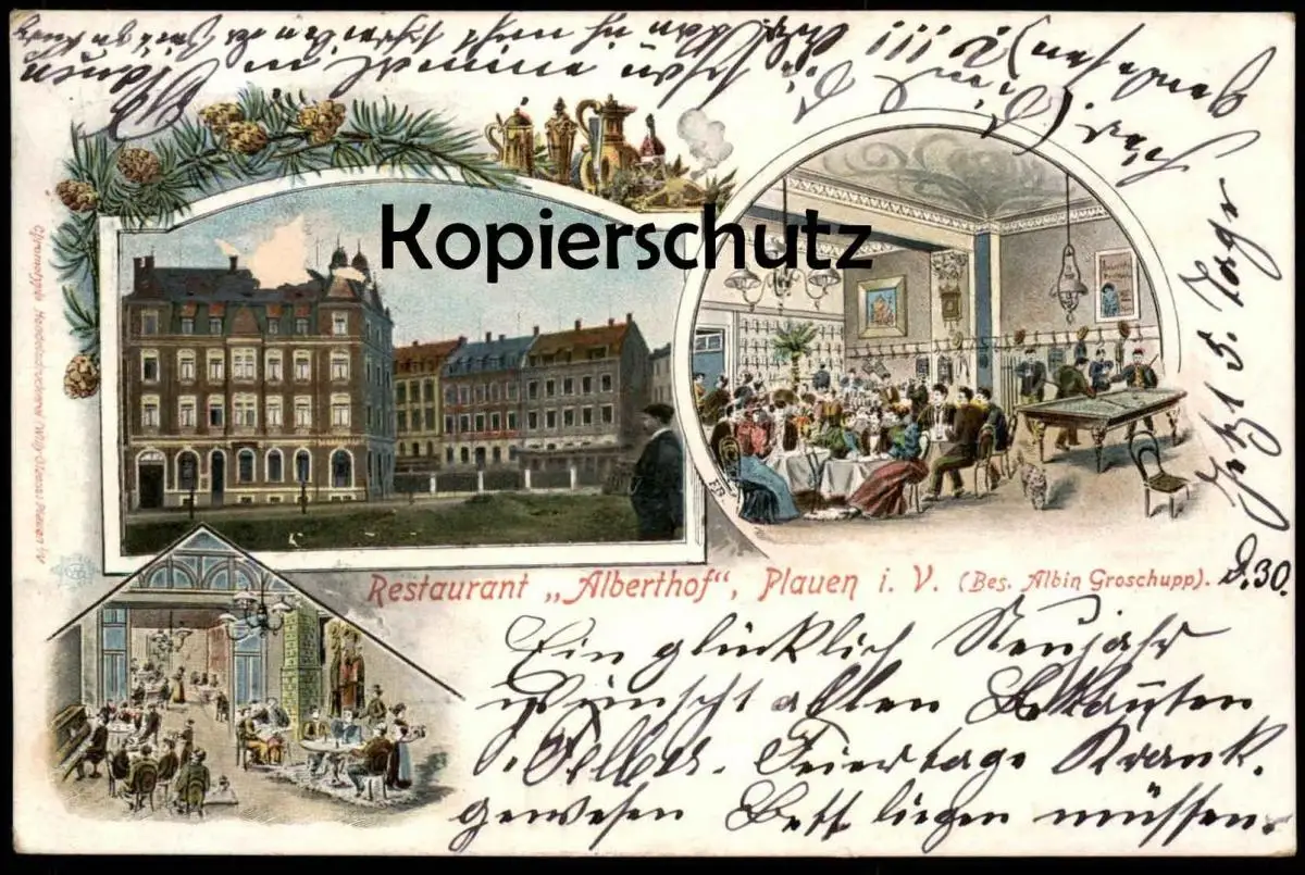 ALTE LITHO POSTKARTE RESTAURANT ALBERTHOF PLAUEN IM VOGTLAND BESITZER ALBIN GROSCHUPP Billard billiard Ansichtskarte AK