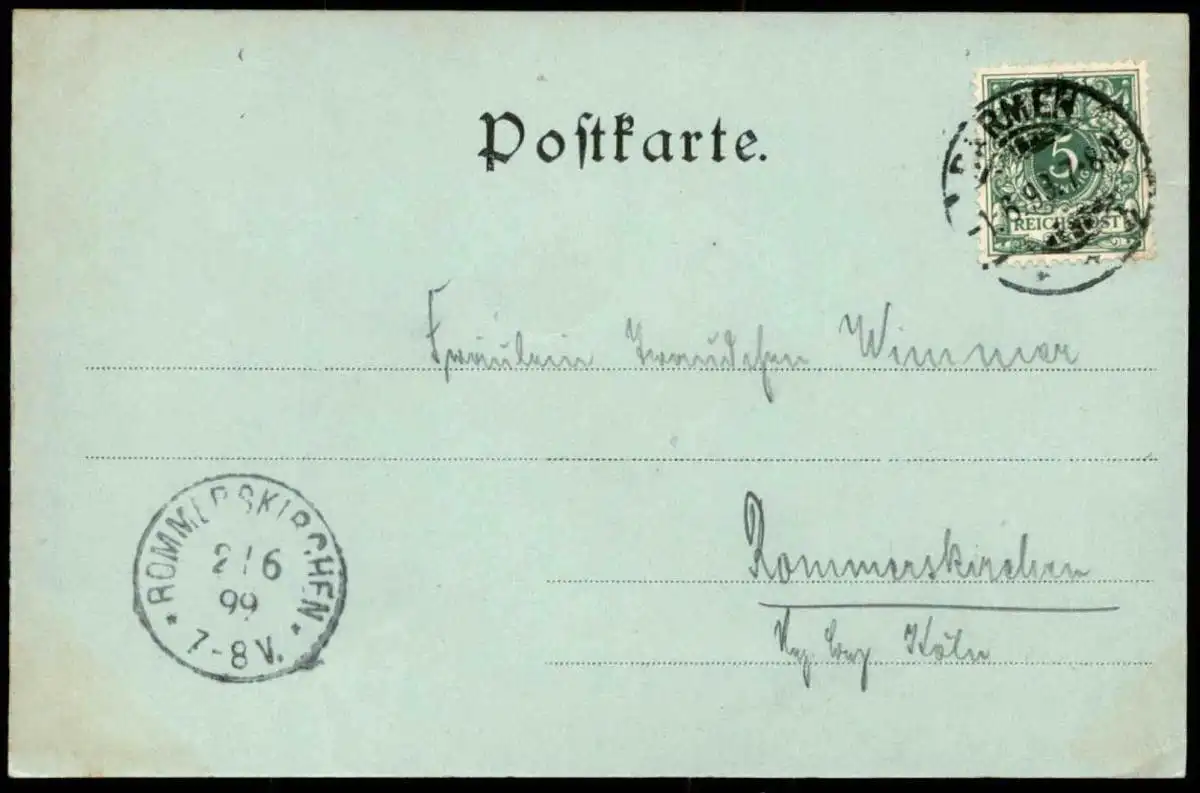 Gelaufen: 01.06.1899 mit Stempel Barmen nach Rommerskirchen