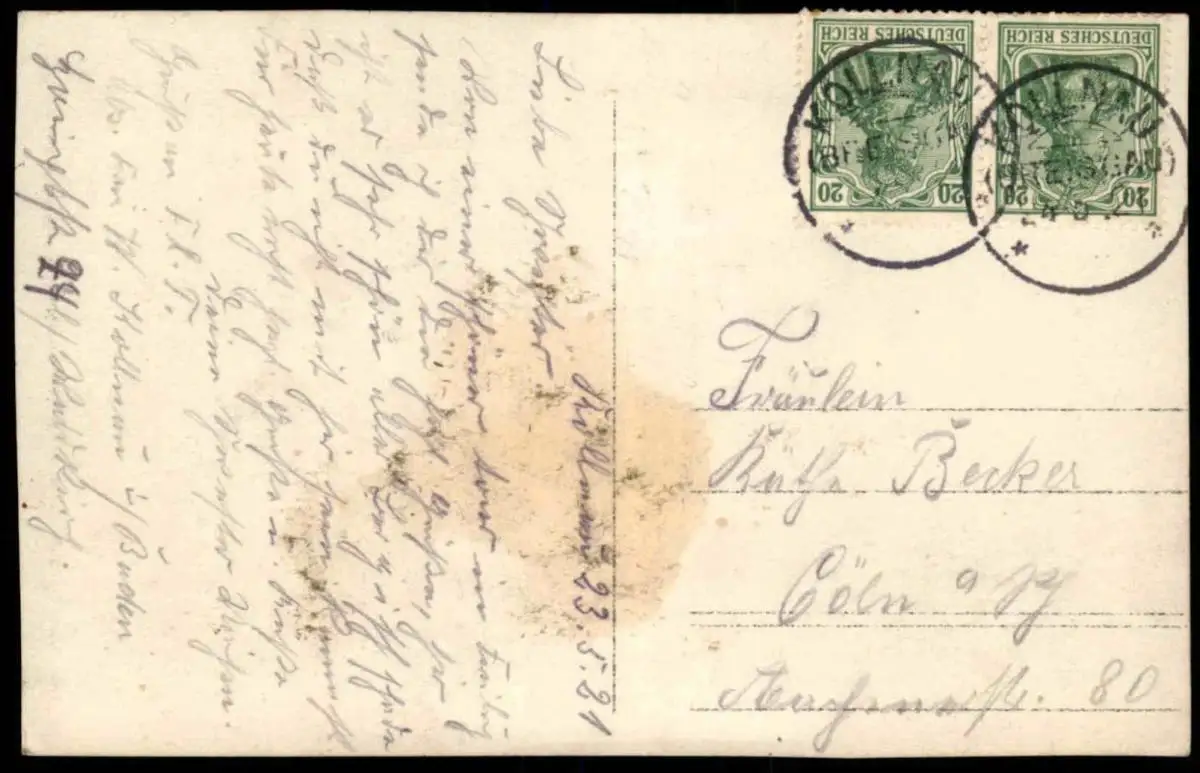 Gelaufen: 23.05.1921 mit Stempel Kollnau nach CölnErhaltung (s. Scan): gut, rückseitig mittig leichte Verfärbung / 916629