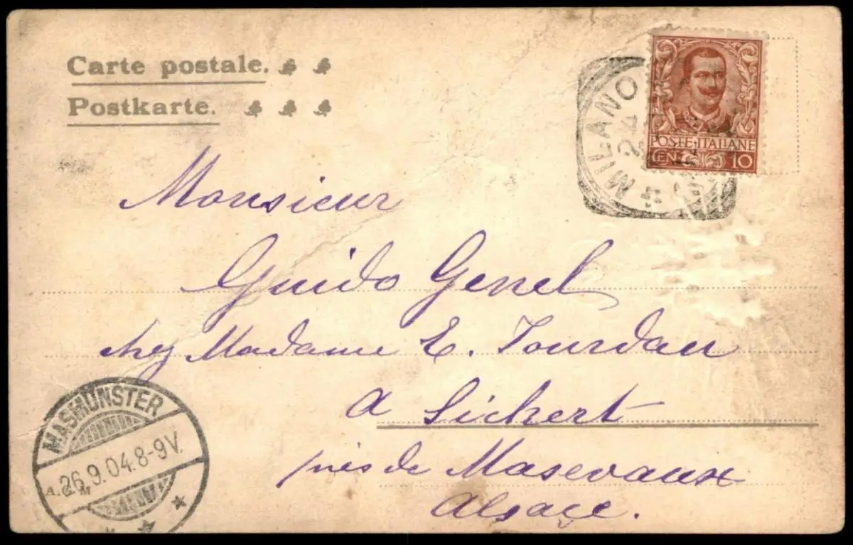 Gelaufen: 25.09.1904 mit Stempel Milano sowie Masmünster