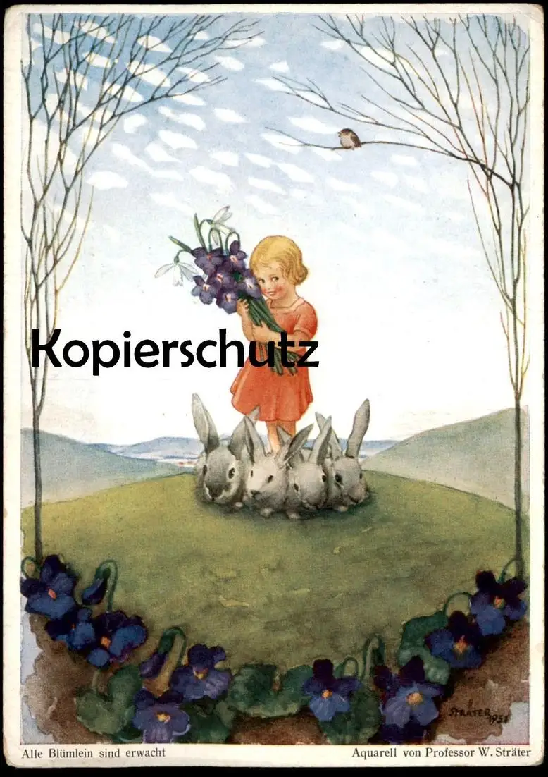 ALTE POSTKARTE ALLE BLÜMLEIN ERWACHT KIND HASEN AQUARELL VON PROFESSOR STRÄTER Hase child Ansichtskarte cpa AK postcard