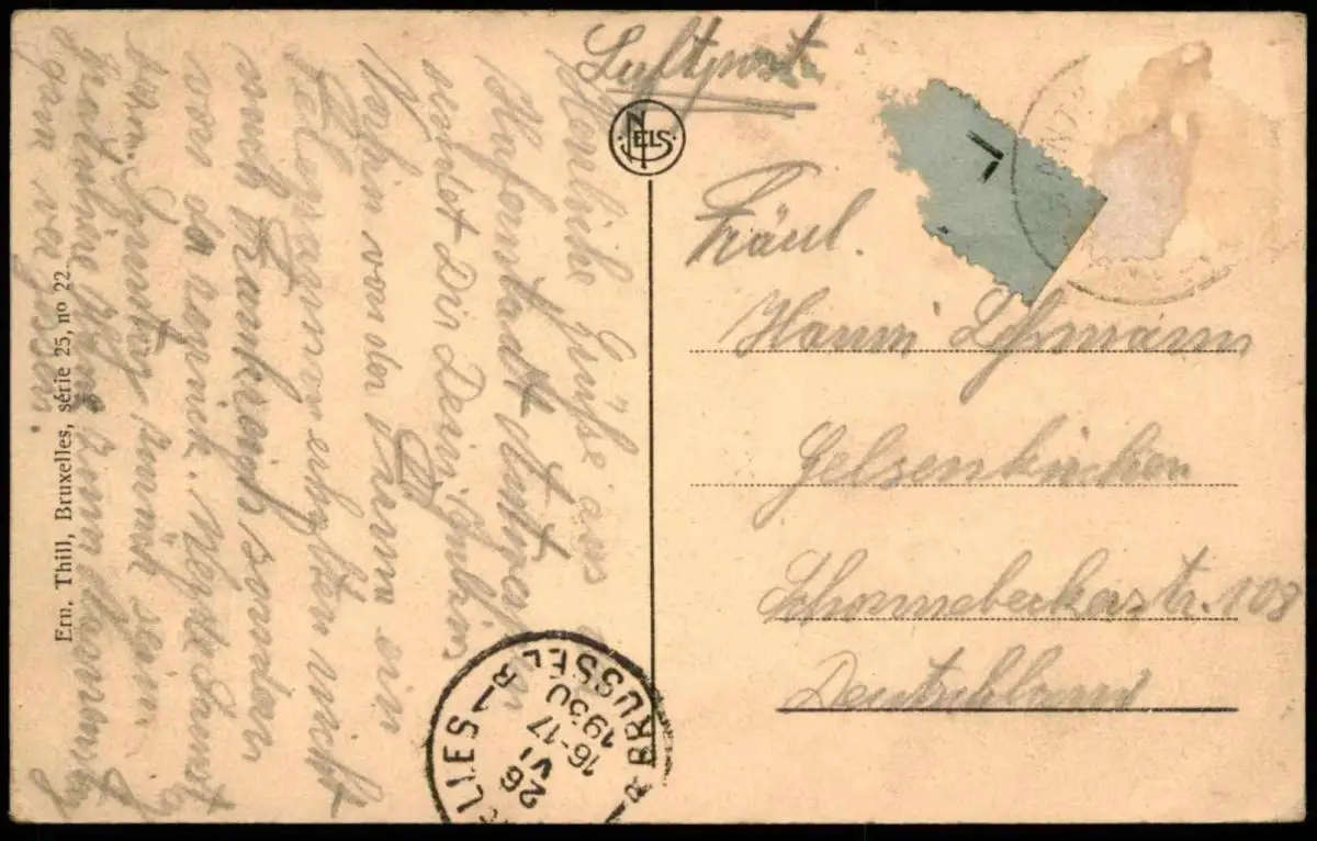 Gelaufen: 22.06.1930 mit Stempel Bruxelles nach Gelsenkirchen, Briefmarke (sauber) entfernt