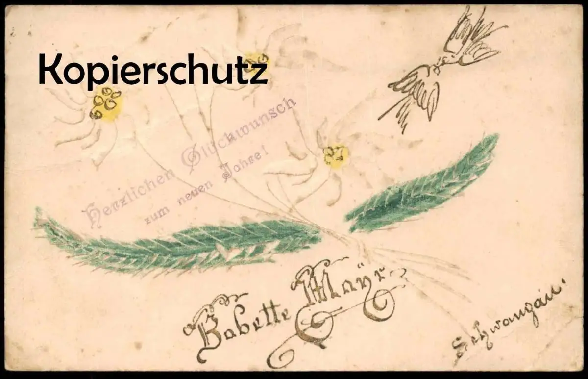 ALTE INDIVIDUALISIERTE NEUJAHRS PRÄGE-POSTKARTE BABETTE MAYR SCHWANGAU EDELWEISS & TANNE