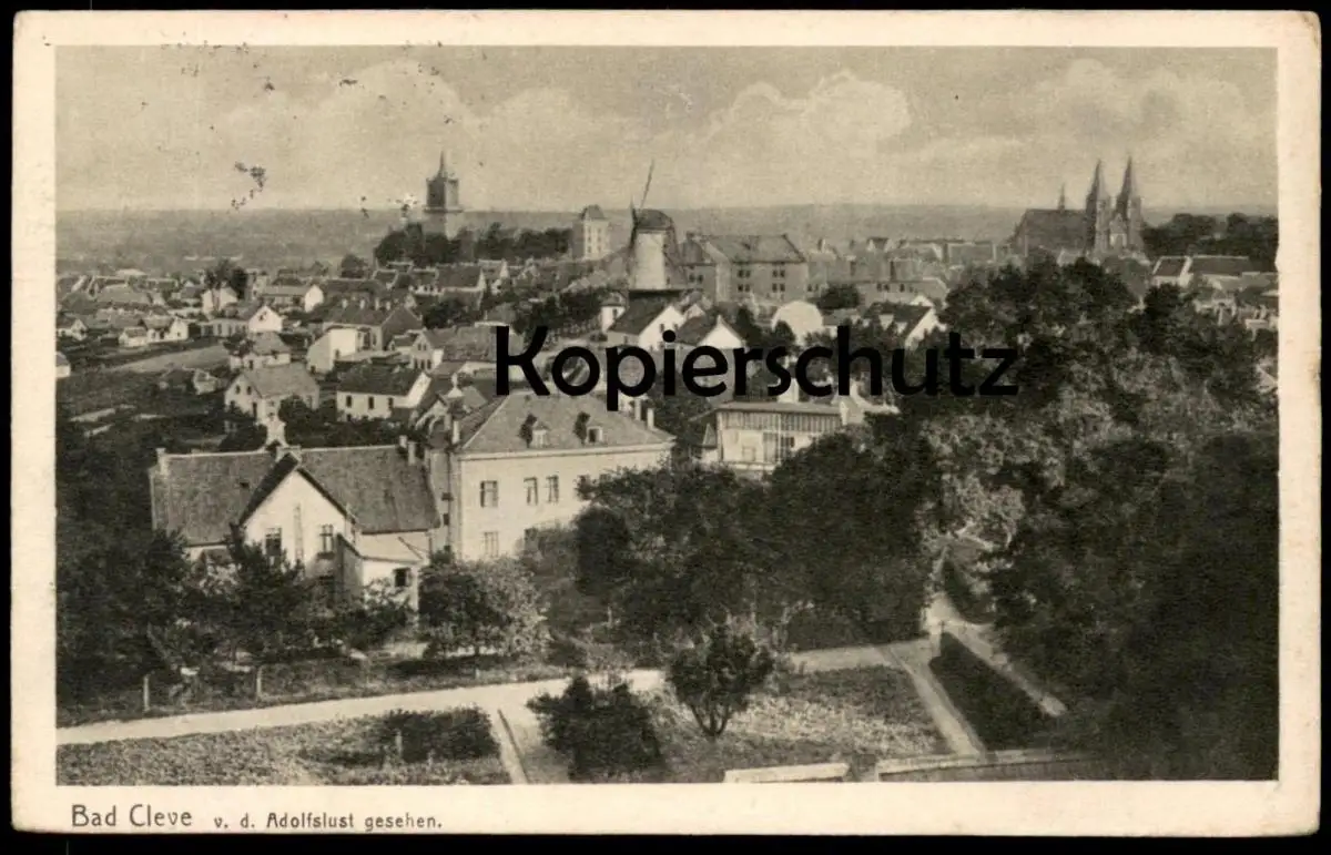 ALTE POSTKARTE BAD CLEVE VON DER ADOLFSLUST GESEHEN WINDMÜHLE KIRCHE rückseitig Stempel Hotel Restaurant Schwanenburg, Anno HeinrichsVerlag: Jos. Labs jr., Cleve, Ansichtskartenhaus 1925
