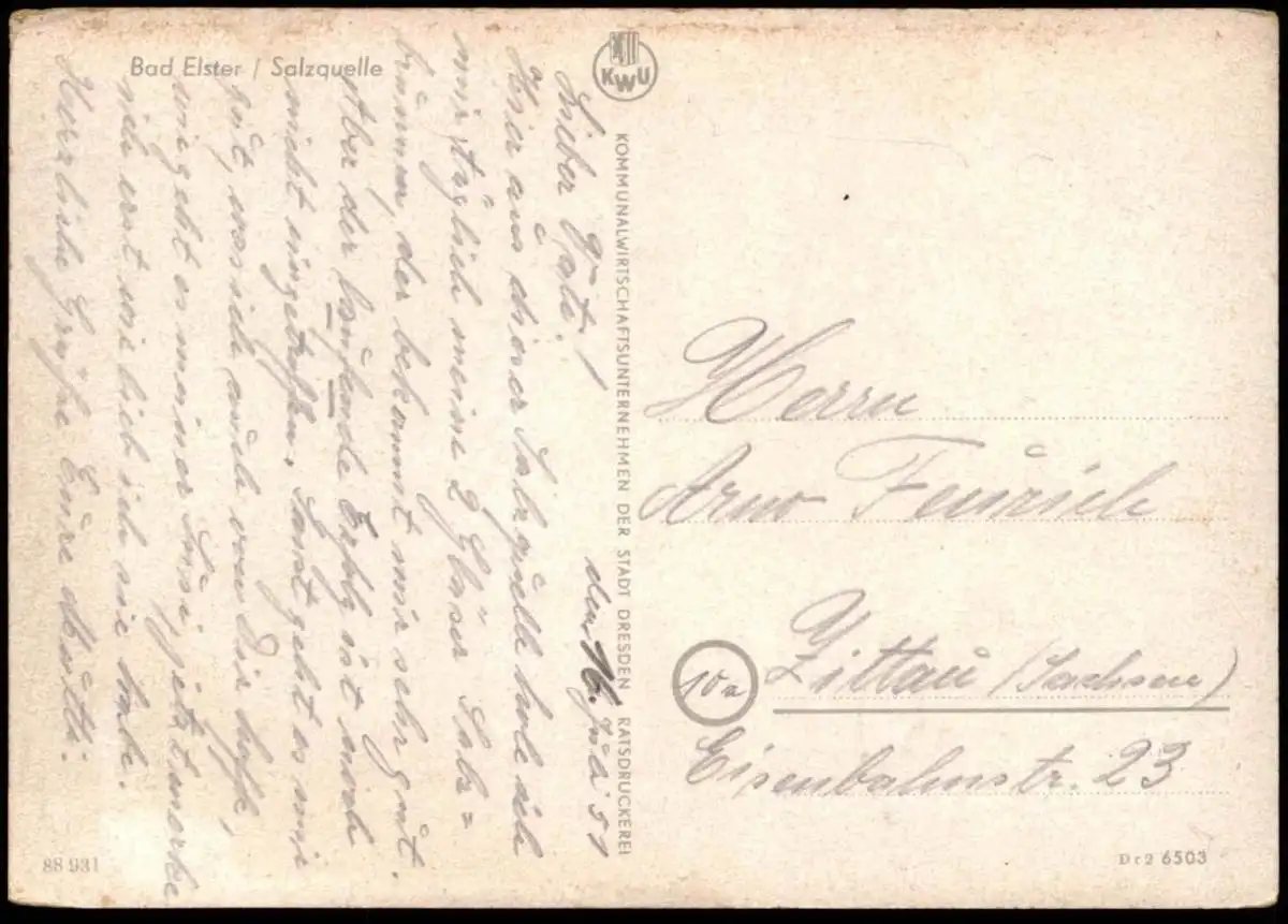 Verlag: Kommunalwirtschaftsunternehmen der Stadt Dresden, RatsdruckereiGelaufen: nein, beschrieben 16.07.1951 nach ZittauErhaltung (s. Scan): gut, rechte obere Ecke leicht bestoßen / 918738