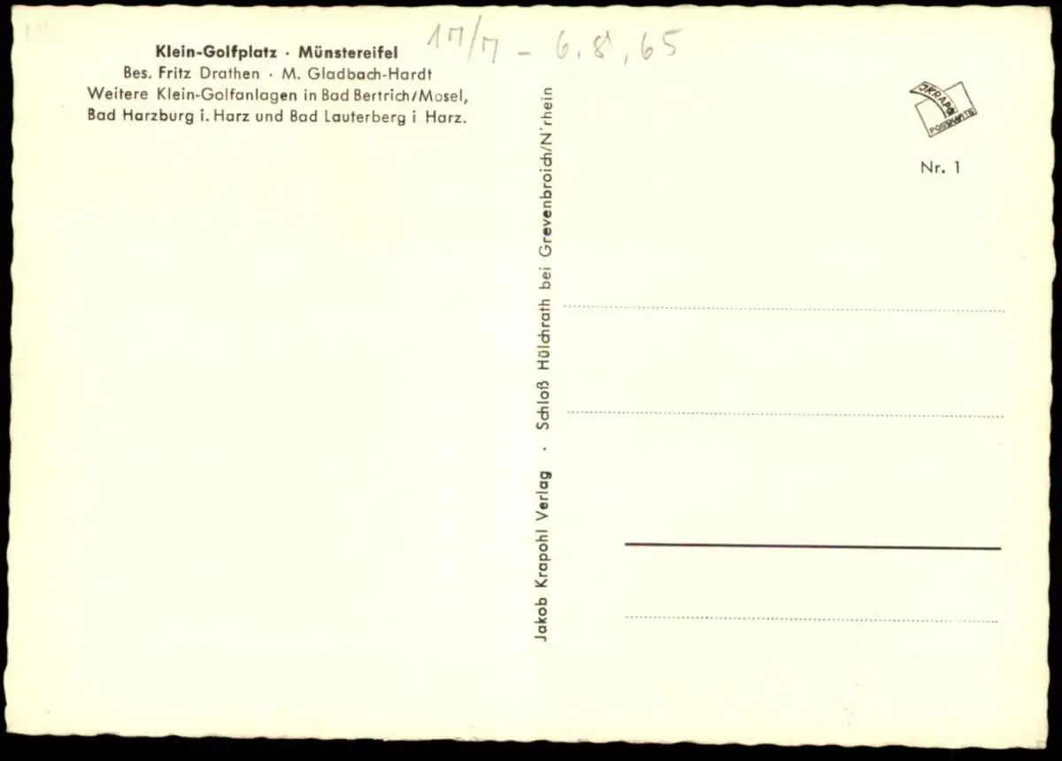 ALTE POSTKARTE BAD MÜNSTEREIFEL KLEIN-GOLFPLATZ MINIATUR WINDMÜHLE BESITZER FRITZ DRATHEN, MÖNCHENGLADBACH-HARDT, WEITERE KLEIN-GOLFANLAGEN IN BAD BERTRICH MOSEL BAD HARZBURG IM HARZ UND BAD LAUTERBERG IM HARZ