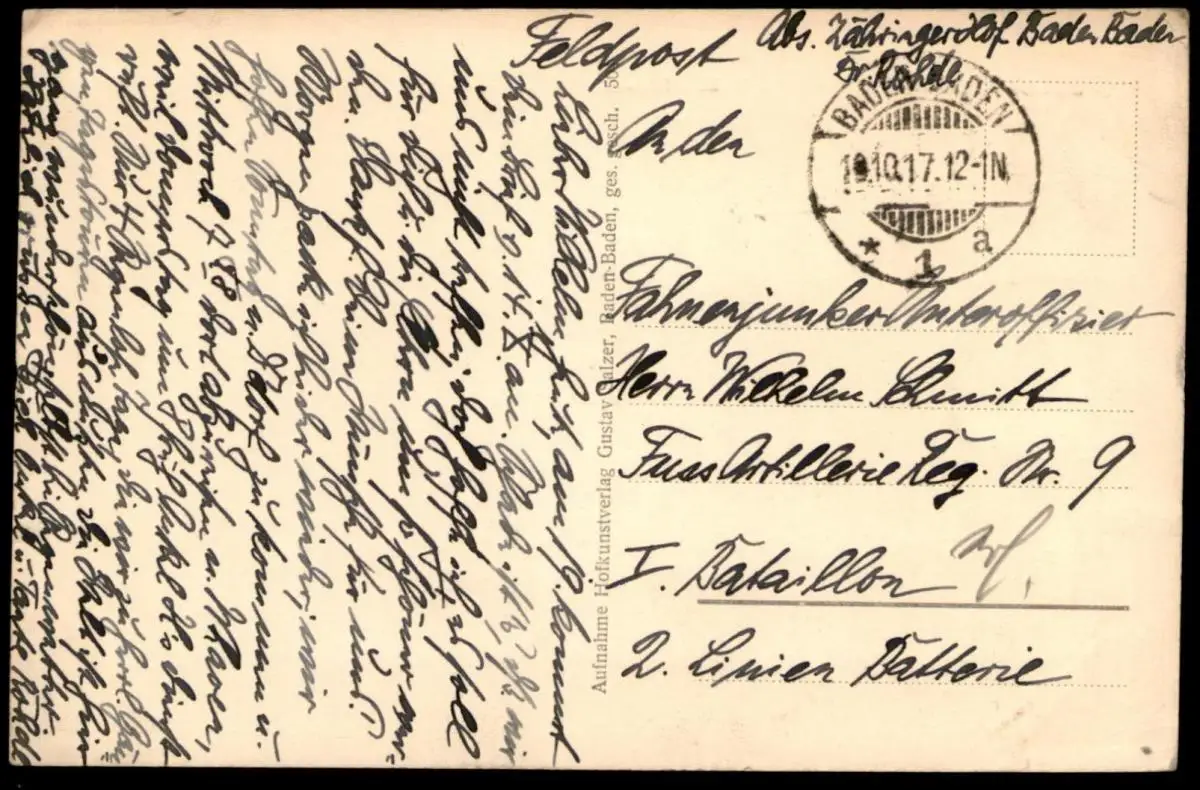Gelaufen: 19.10.1917 als Feldpost mit Stempel Baden-Baden zur Fussartillerie Nr. 9 I. Bataillon 2. Linien Batterie