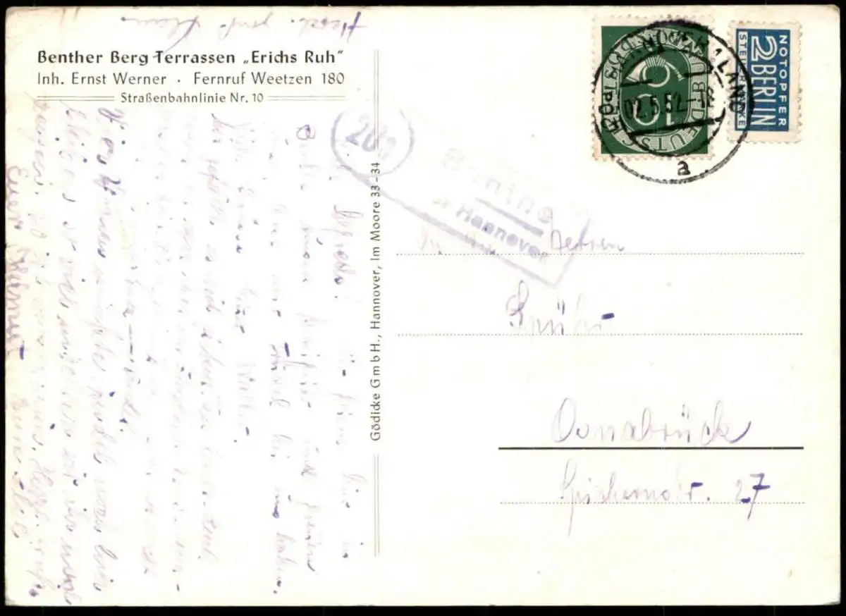ALTE POSTKARTE BENTHE BENTHER TERRASSEN ERICHS RUH INHABER ERNST WERNER FERNRUF WEETZEN RONNENBERG HANNOVER