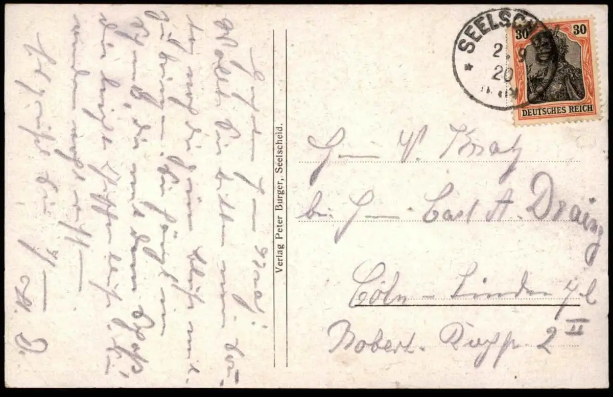 Gelaufen: 02.09.1920 mit Stempel Seelscheid nach Cöln-Lindenthal
