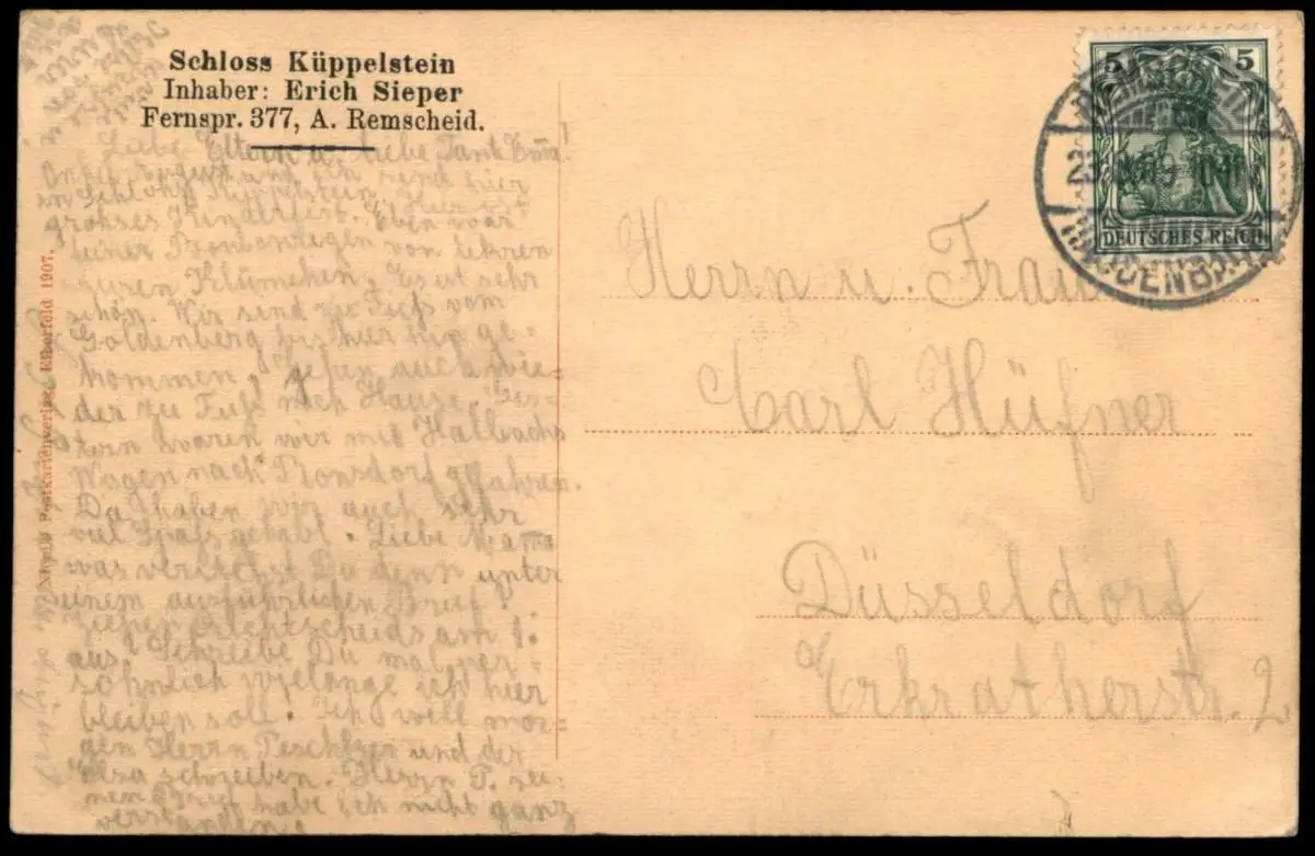 ALTE POSTKARTE BERGISCHES LAND SCHLOSS KÜPPELSTEIN, Inhaber Erich Sieper Fernsprecher 377Verlag: Niem´s Postkartenverlag, Elberfeld 1907