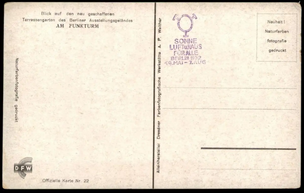 ALTE POSTKARTE BLICK AUF DEN TERRASSENGARTEN DES BERLINER AUSSTELLUNGSGEBÄUDE AM FUNKTURM BERLIN 1932Verlag: A. P. Walther, Dresden, Dresdner Farbenfotografische Werkstätte