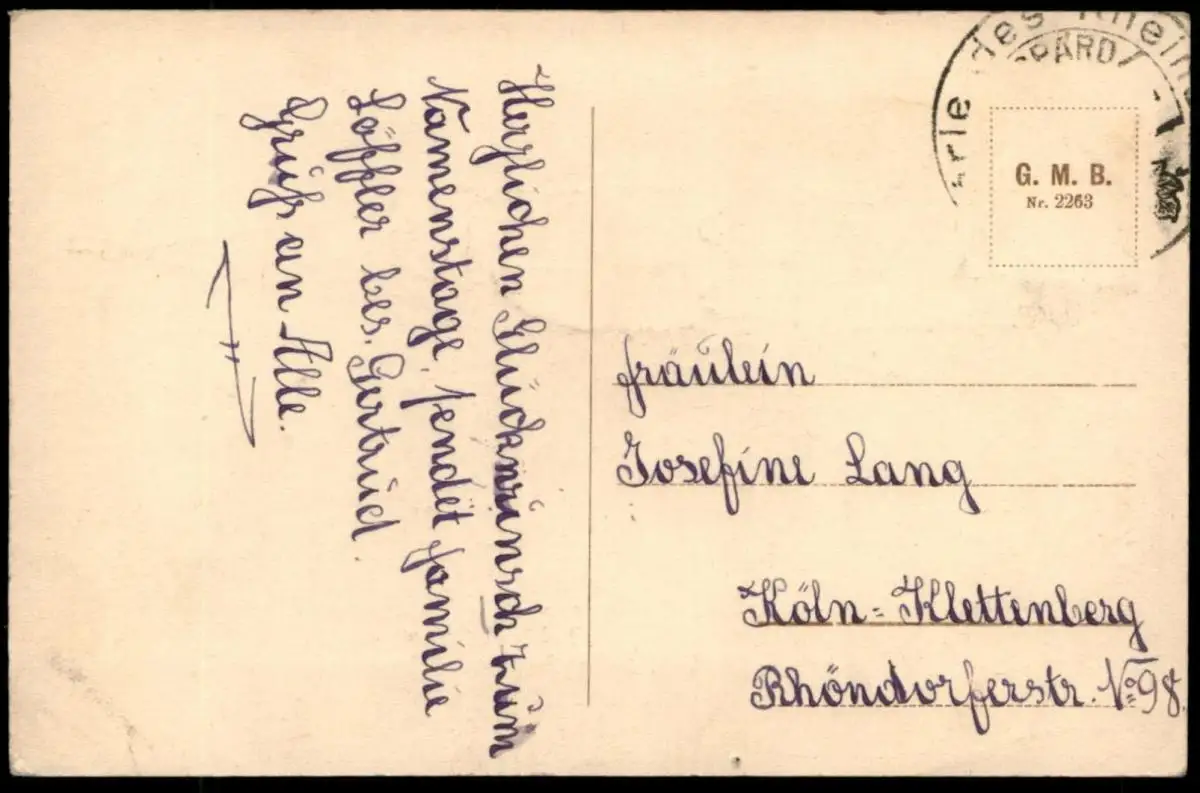 Gelaufen: xx.xx.192x mit Stempel Boppard nach Köln-Klettenberg, Briefmarke (sauber) entfernt