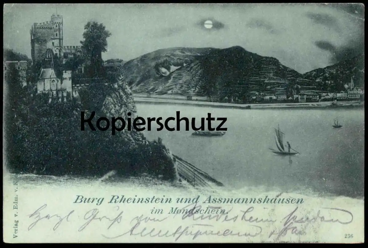 ALTE POSTKARTE BURG RHEINSTEIN MIT ASSMANNSHAUSEN IM MONDSCHEIN 1899 RHEIN Mond Rheinromantik Ansichtskarte postcard