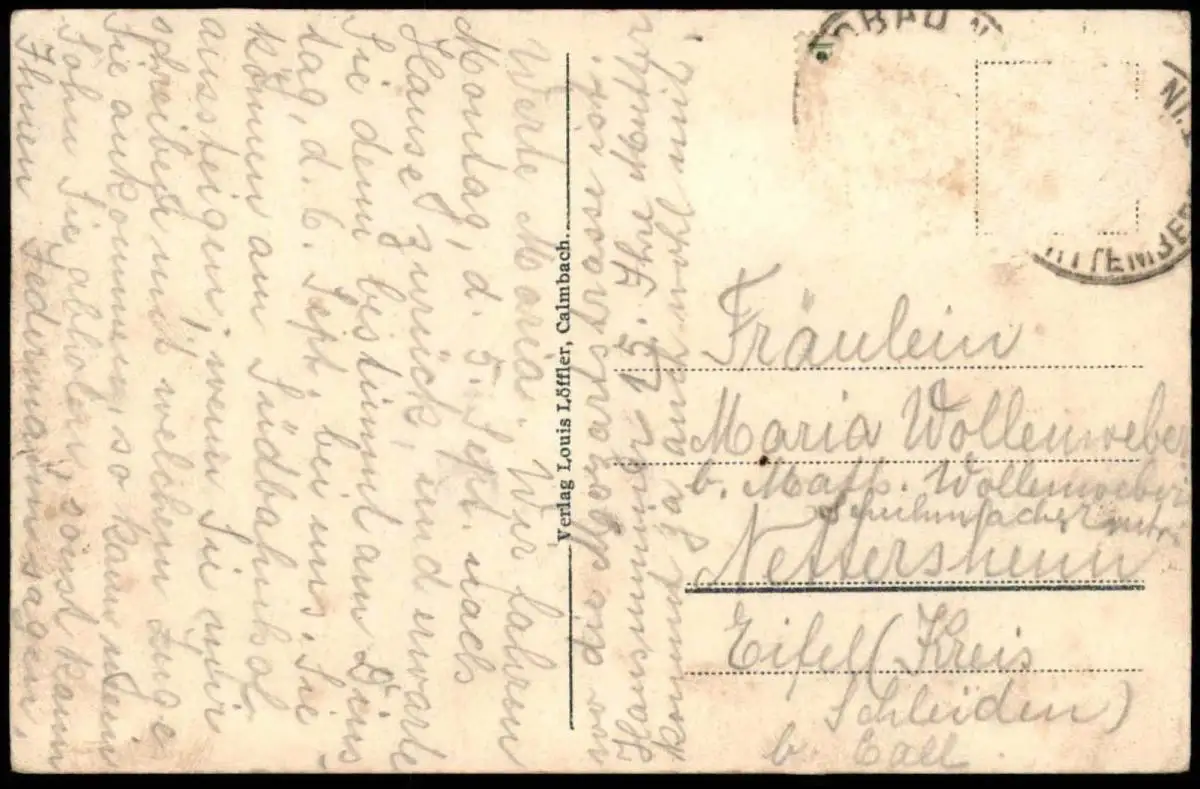 Gelaufen: xx.xx.19xx nach Nettersheim, Briefmarken (sauber) entfernt