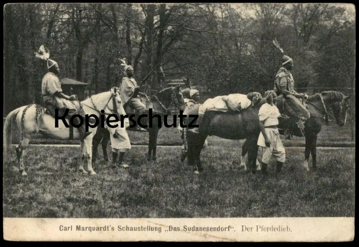 ALTE POSTKARTE CARL MARQUARDT'S SCHAUSTELLUNG DER PFERDEDIEB SUDANESENDORF SENNELAGER Leopard-Fell Sudan indigene native