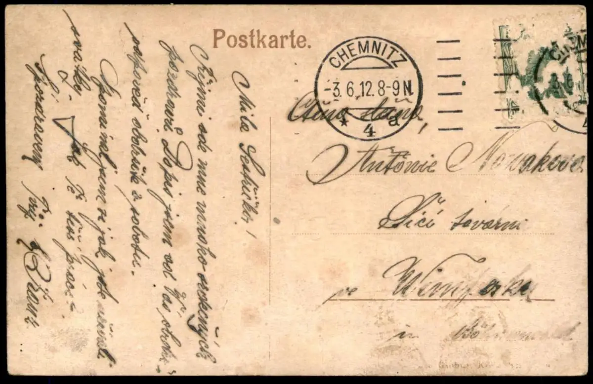 Gelaufen: 03.06.1912 mit Stempel Chemnitz, Briefmarke teilweise entfernt