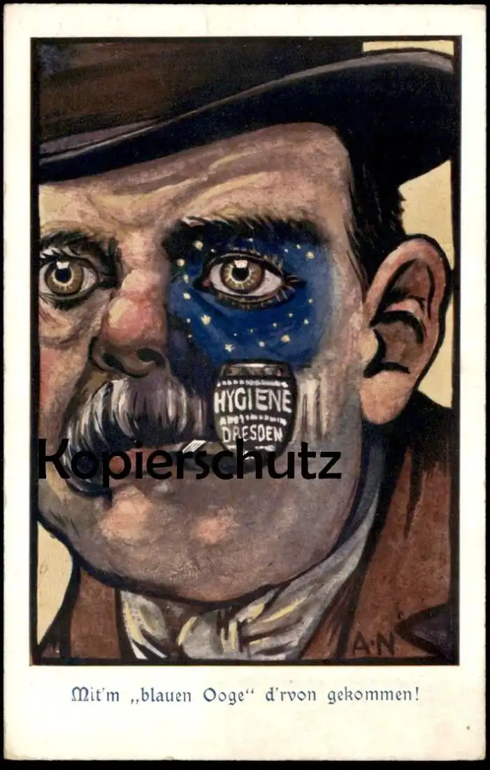 ALTE POSTKARTE DRESDEN HYGIENE MIT´M BLAUEN OOGE D´RVON GEKOMMEN! HYGIENEAUSSTELLUNG 1911 KÜNSTLER SIGNATUR AN