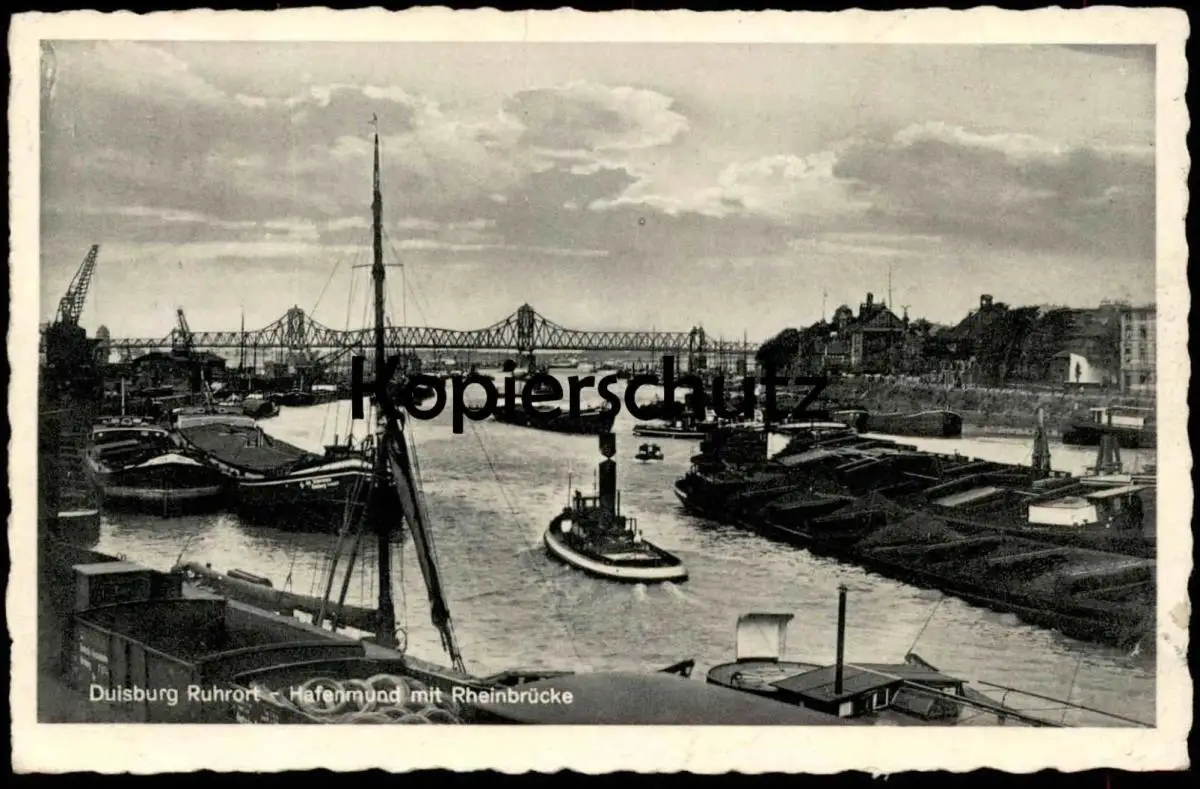 ALTE POSTKARTE DUISBURG RUHRORT HAFENMUND MIT RHEINBRÜCKE ZWISCHEN RUHRORT UND HOMBERGVerlag: Ad. Hallensleben, Duisburg Ruhrort 1933Gelaufen: 23.07.1933 mit Stempel Homberg nach OsterfeldErhaltung (s. Scan): gut, rechts unten minimal bestoßen / 916367