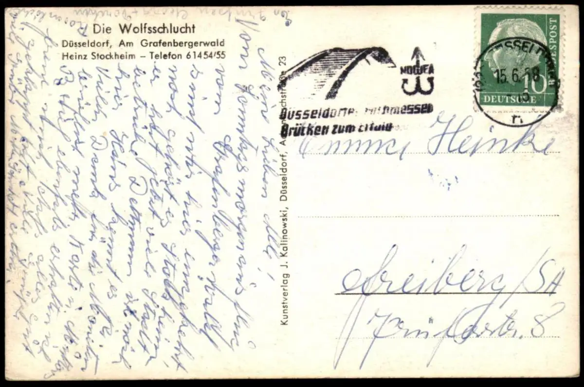 Gelaufen: 15.06.1958 mit Stempel Düsseldorf sowie Messe Düsseldorf Brücke Anker nach Freiberg Sachsen