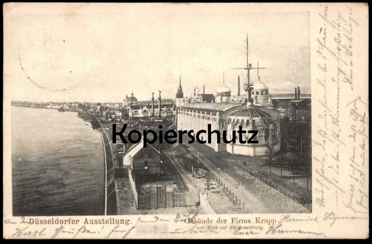 ALTE POSTKARTE DÜSSELDORFER AUSSTELLUNG 1902 GEBÄUDE DER FIRMA KRUPP UND BLICK AUF DIE AUSSTELLUNG