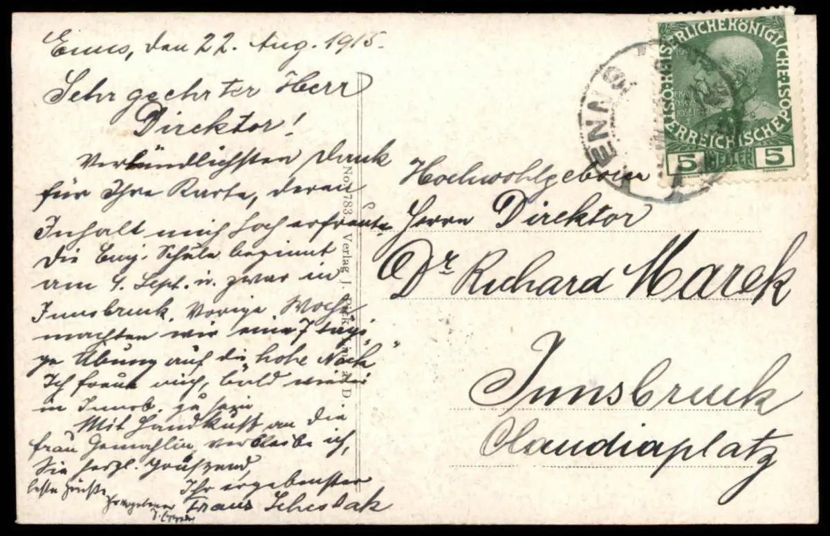 Gelaufen: 22.08.1915 mit Stempel Enns nach Innsbruck