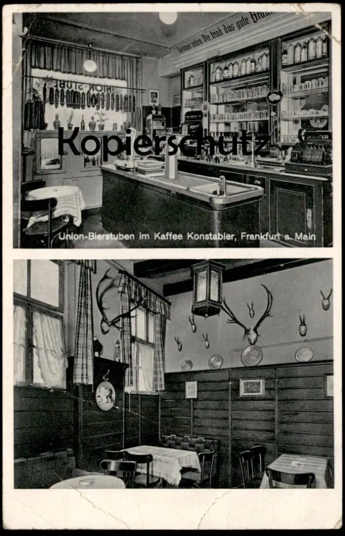 ALTE POSTKARTE FRANKFURT AM MAIN UNION BIERSTUBEN IM KAFFEE KONSTABLER DORTMUNDER UNION PILS EGERER URBRÄU SUDETENGAU FRANKFURTER BRAUHAUS BIERE WAAGE THEKE WURST FEIST PONY SEKT