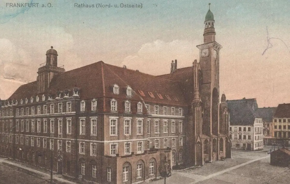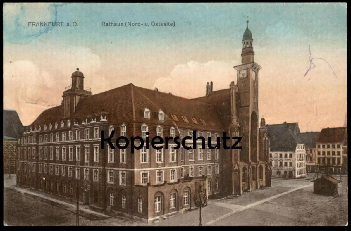 ALTE POSTKARTE FRANKFURT AN DER ODER RATHAUS NORD- UND OSTSEITE VERFASSER BESCHREIBT ANKUNFT IN DER GARNISON