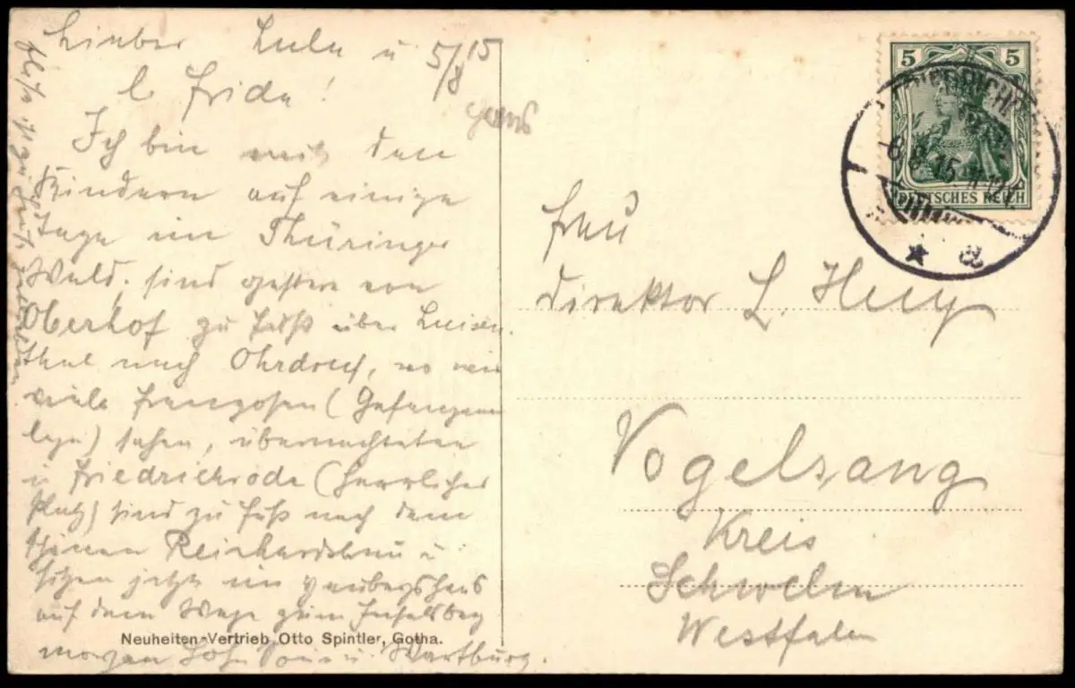 Gelaufen: 06.08.1915 mit Stempel Friedrichroda nach Vogelsang Kreis Schwelm