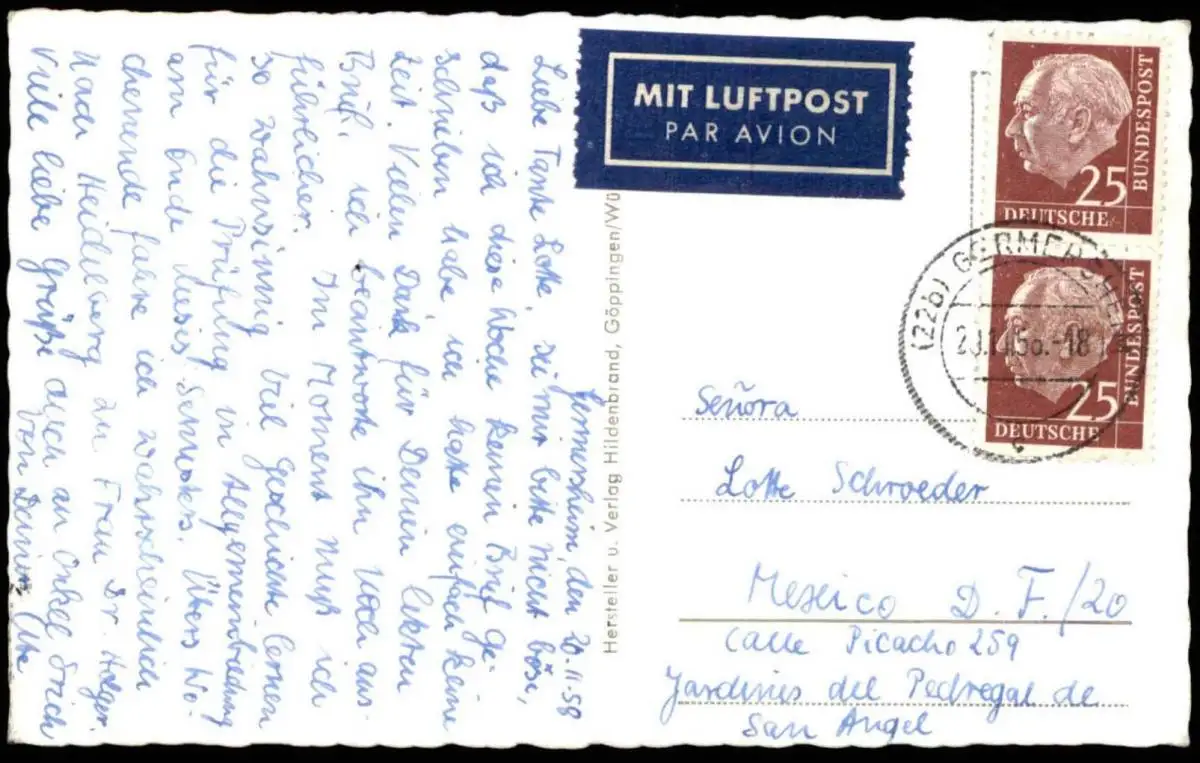 Gelaufen: 20.11.1956 mit Stempel Germersheim nach Jardines del Predegal Mexico Mexiko