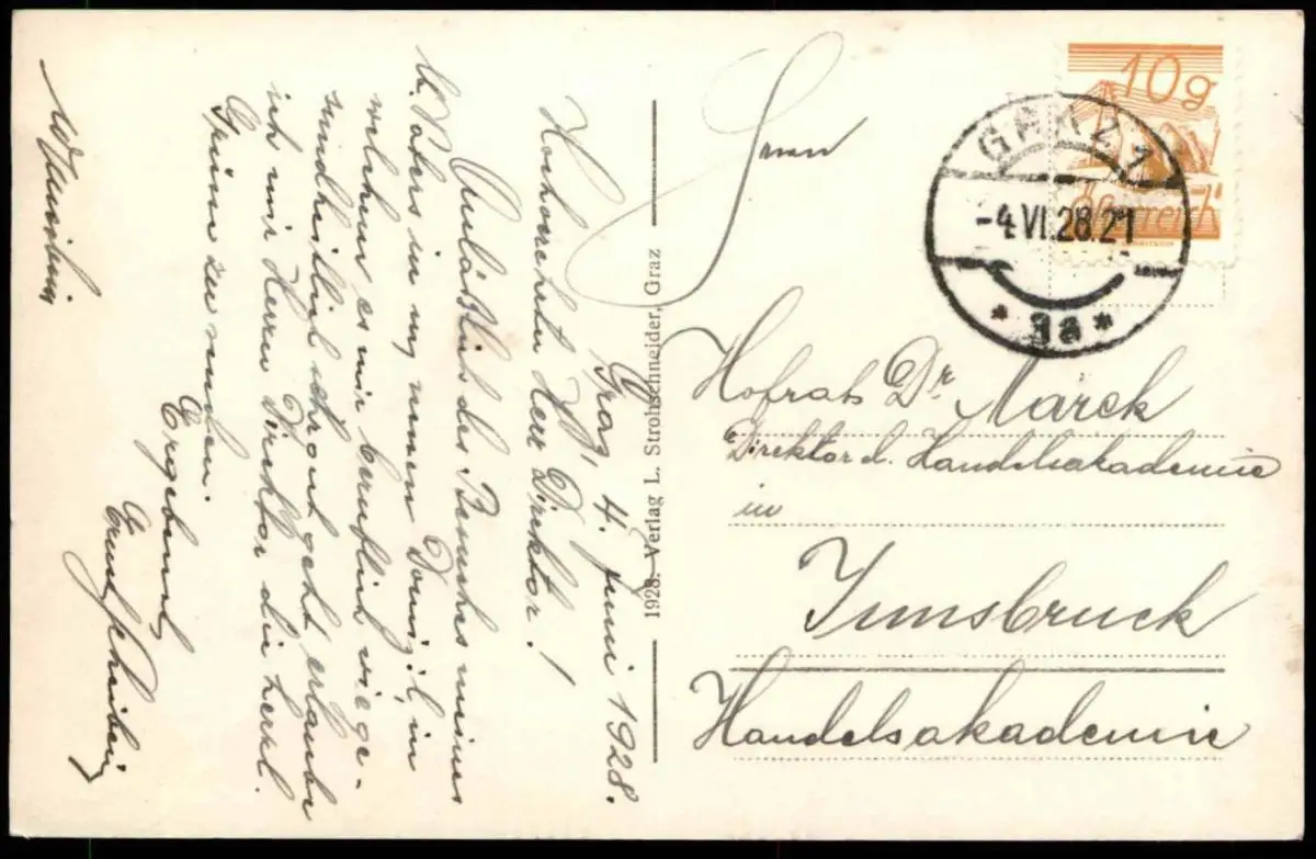 Gelaufen: 04.06.1928 mit Stempel Graz 1 nach Innsbruck HandelsakamdemieErhaltung (s. Scan): mittel, linksseitig oben leichter Knick / 916449