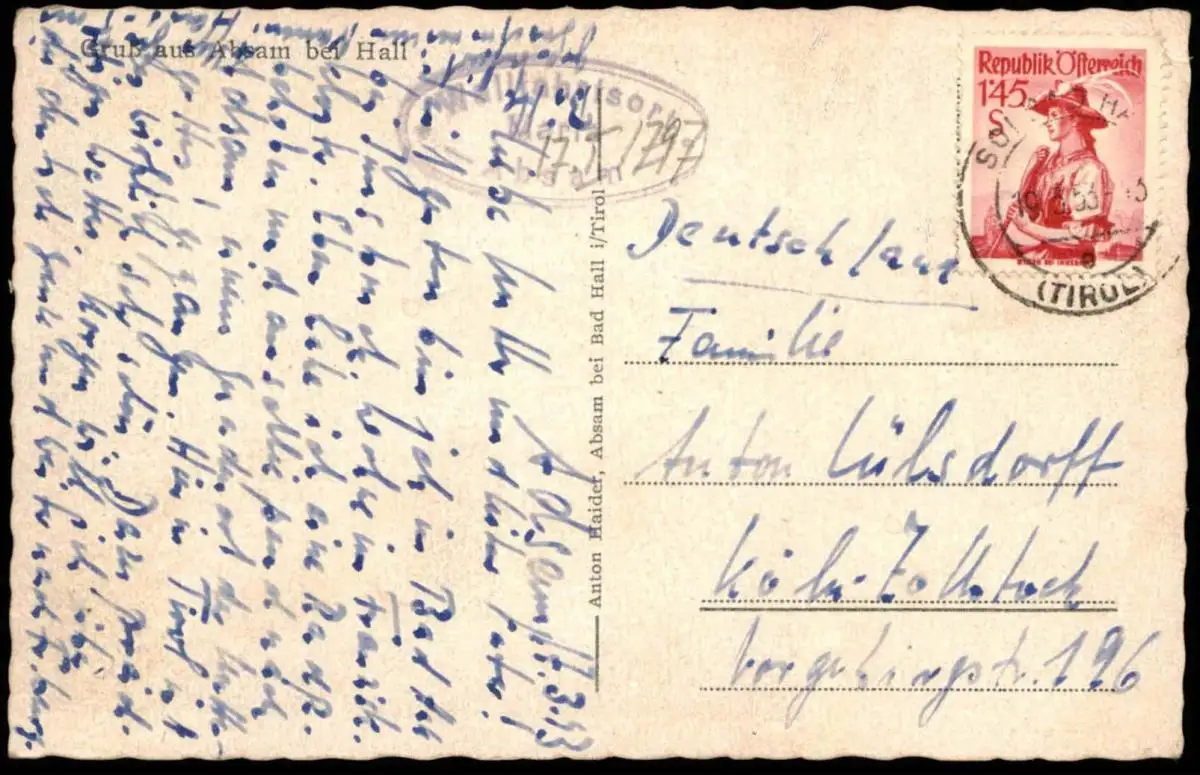 Gelaufen: 19.03.1953 mit Stempel Solbad Hall nach Köln Zollstock