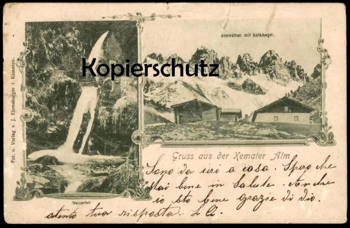 ALTE POSTKARTE GRUSS AUS DER KEMATER ALM MIT KALKKEGEL WASSERFALLVerlag: J. Ehrensberger, Kematen