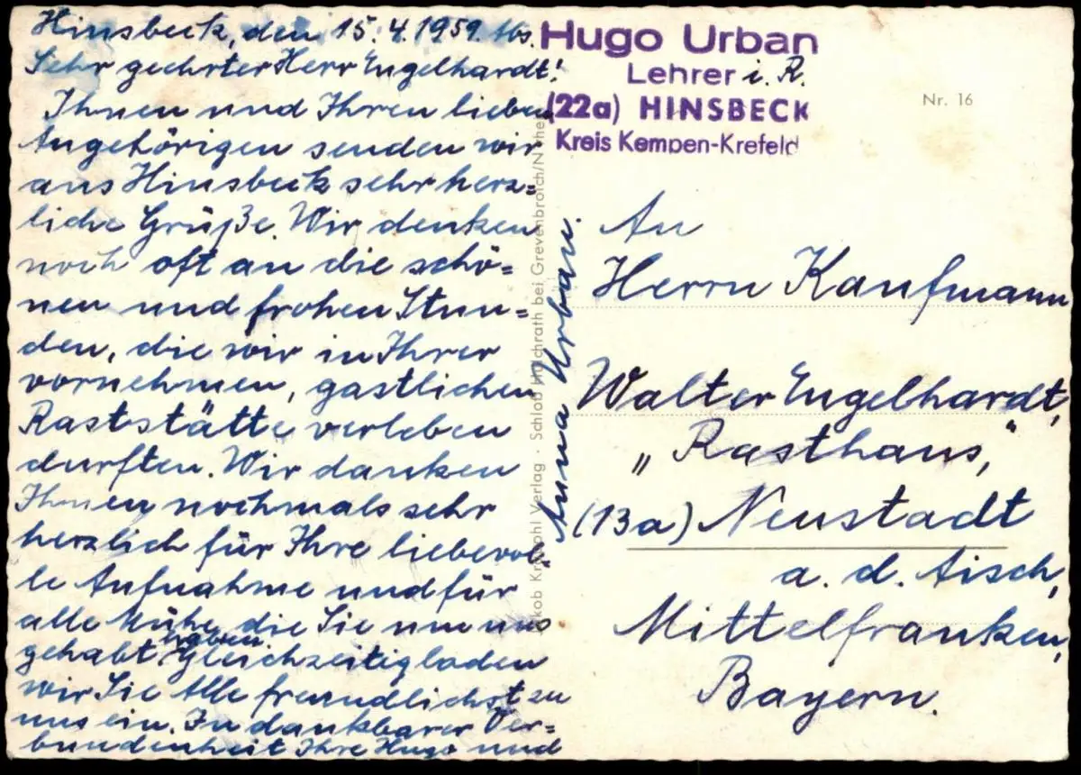 Gelaufen: 15.04.1959 von Lehrer Hugo Urban Hinsbeck nach Neustadt an der AischErhaltung (s. Scan): gut, linke untere Ecke minimal bestoßen / 918373