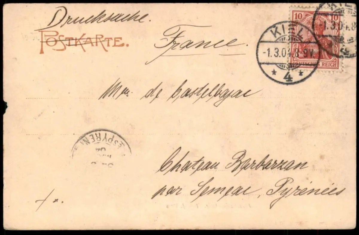 Verlag: A. Rehmke, KielGelaufen: 01.03.1904 mit Stempel Kiel nach Chateau Barbazan PyrénéesErhaltung (s. Scan): schlechter, rechtsseitig beschädigt / 915777