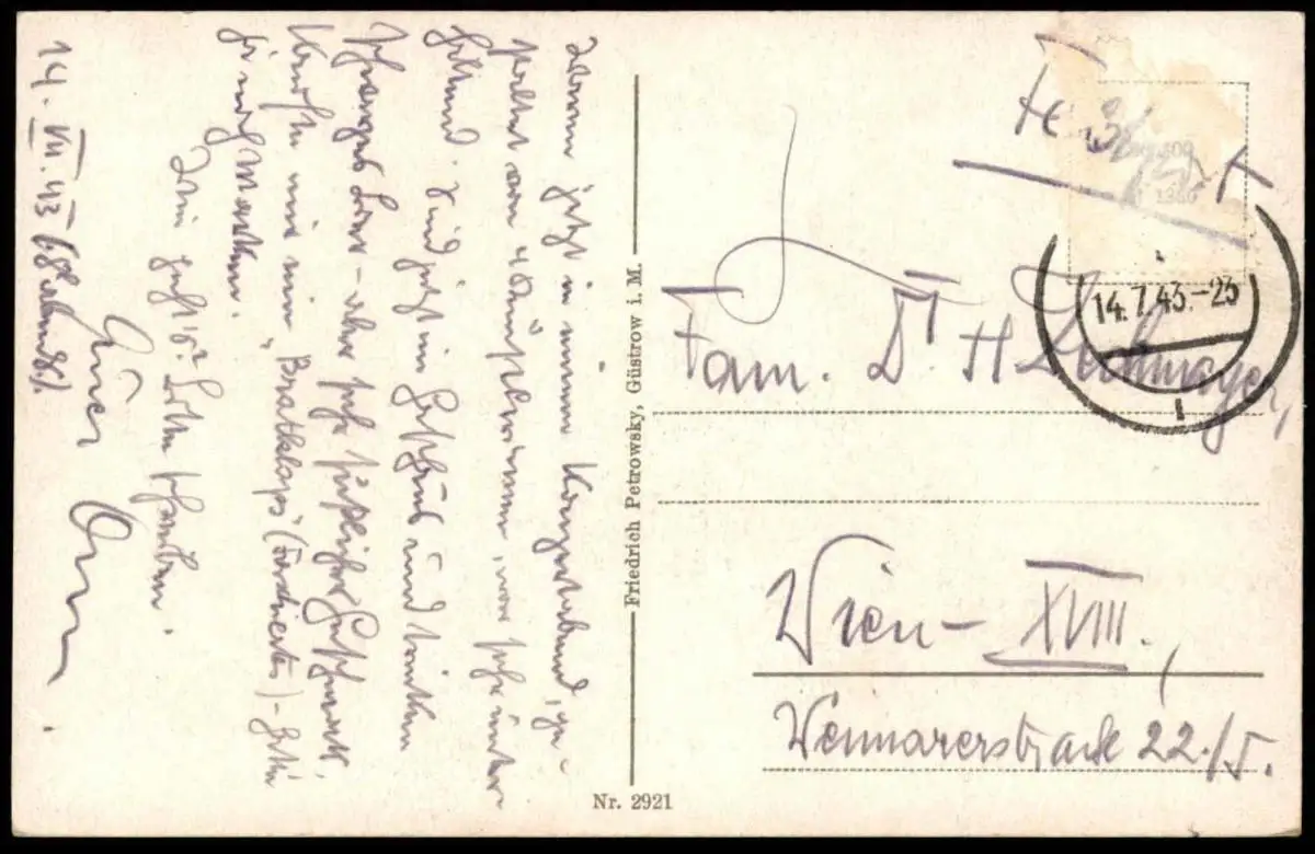 ALTE POSTKARTE GÜSTROW I. M. EISENBAHNBRÜCKE MIT BLICK AUF DIE A. H. (UNKENNTLICH GEMACHT) STRASSEVerlag: Friedrich Petrowsky, GüstrowGelaufen: 14.07.1943 als Feldpost nach Wien XVIII., Briefmarke entferntErhaltung (s. Scan): mittel, linksseitig etwas bestoßen / 918337