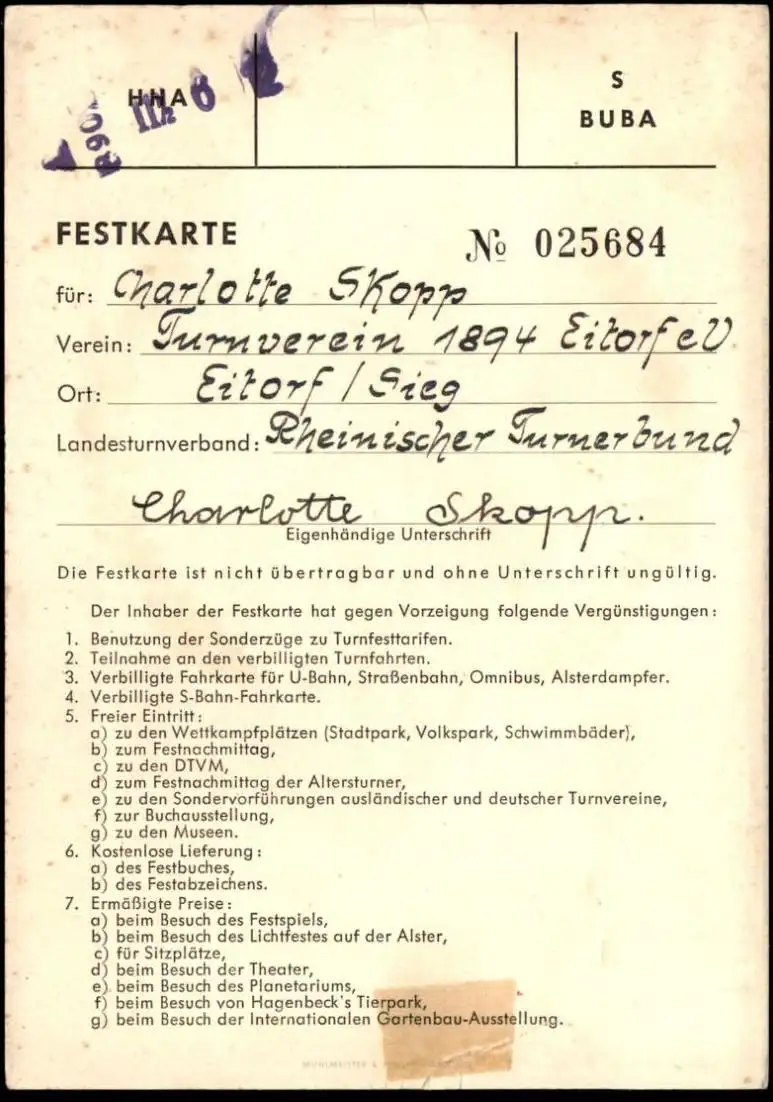 ALTE POSTKARTE HAMBURG DEUTSCHES TURNFEST 1953 DTB FESTKARTE WAPPEN DER INHABER DER FESTKARTE HAT GEGEN VOZEIGUNG FOLGENDE VERGÜNSTIGUNGEN BENUTZUNG SONDERZÜGE TEILNAHME AN DEN VERBILLIGTEN TURNFAHRTEN VERBILLIGTE FAHRKARTE FÜR U-BAHN STRASSENBAHN OMNIBUS ALSTERDAMPFER FREIER EINTRITT TURNVEREIN EITORF SIEG RHEINISCHER TURNERBUNDVerlag: Karberg