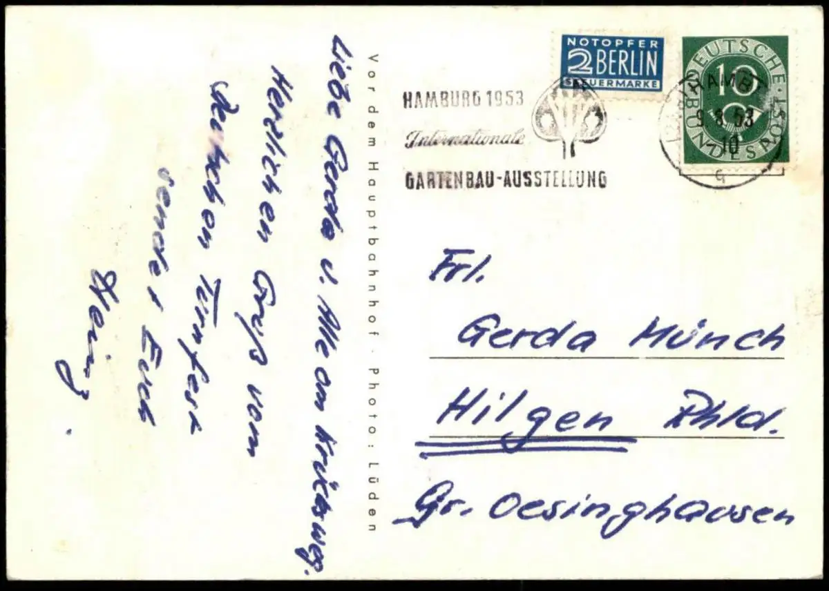 Gelaufen: 09.08.1953 mit Stempel Hamburg nach Hilgen Groß-Oesinghausen