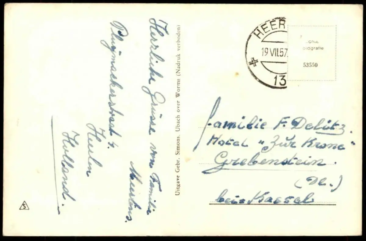Gelaufen: 19.07.1957 mit Stempel Heerlen nach Grebenstein, Briefmarke (sauber) entferntErhaltung (s. Scan): gut / 915725