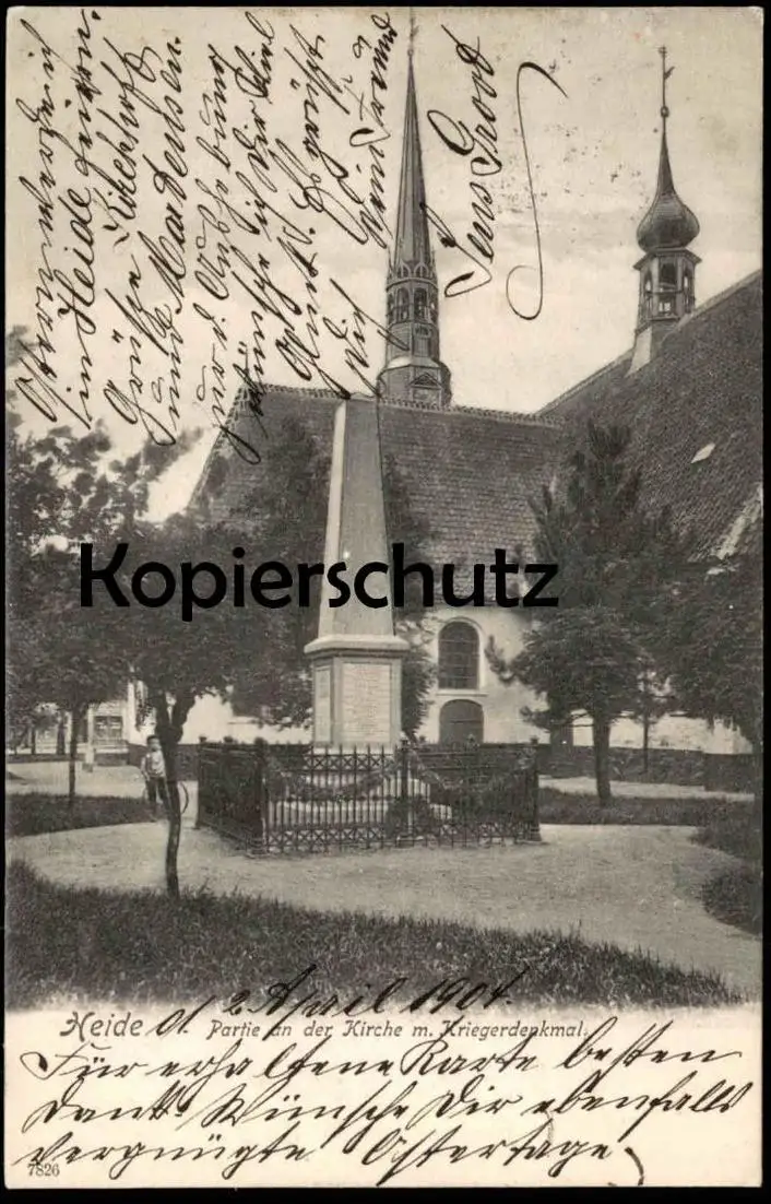 ALTE POSTKARTE HEIDE PARTIE AN DER KIRCHE MIT KRIEGERDENKMAL, erwähnt werden im Text Kirchhoff und Martensen, denen vom Verfasser Jens Groot Grüße auszurichten sind Verlag: Reinicke & Rubin, Magdeburg 1904