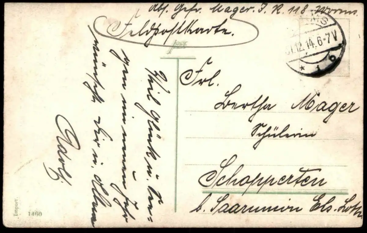 Gelaufen: 31.12.1914 mit Stempel Worms nach SchoppertenErhaltung (s. Scan): gut, an Ecken minimaler Abrieb / 916264